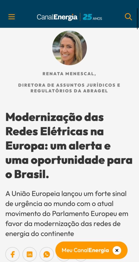 Segue abaixo o link de um artigo de minha autoria, sobre Modernização das Redes Elétricas na Europa: um alerta e uma oportunidade para o Brasil.